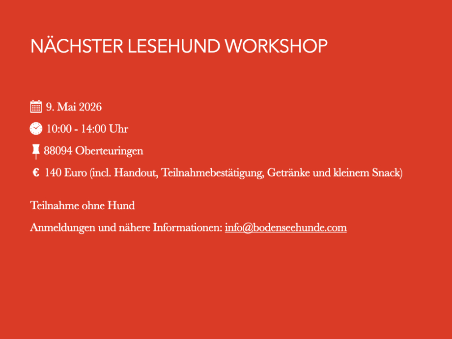 von der kindlichen Lesefähigkeit und typischen Ursachen für Leseschwierigkeiten über die Rolle des Lesehundes bis hin zu Einsätzen in Schulen und Bibliotheken. Zentrale Themen sind auch geeignete Kinderliteratur, Hygiene und Tierschutz sowie Voraussetzungen für Mensch und Hund. Konkrete Tipps zur Vorbereitung und natürlich auch Durchführung des Einsatzes sowie die Körpersprache des Hundes sind ebenfalls Teil des Workshops.